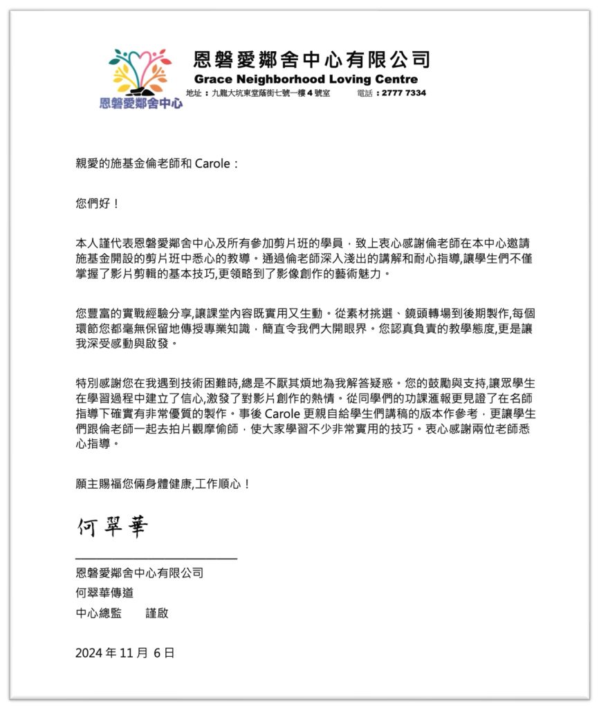 本人謹代表恩磐愛鄰舍中心及所有參加剪片班的學員,致上衷心感謝倫老師在本中心邀請施基金開設的剪片班中悉心的教導。通過倫老師深入淺出的講解和耐心指導,讓學生們不僅掌握了影片剪輯的基本技巧,更領略到了影像創作的藝術魅力。
